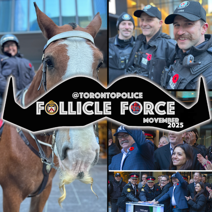 For Movember 2025, team '@TorontoPolice FOLLICLE FORCE' , with the support of the Toronto Police Association, wants to raise the conversation around men's health - especially mental health and suicide prevention. We want to engage men, and those that love them, to have these critical conversations about our health and mental health, and continue to reduce the stigma around these issues. Reach out and ask for help if you need it, or if you recognize someone that does - reach out to *them* - and help us 'stop men dying too young'. It is up to us all - let's help each other out!